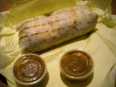 When I got it, the burrito was one of the larger burritos that I have seen in awhile. It’s girth was quite intimidating. Wrapped nicely in the basic fast food yellow wrapper, you could almost get a sense, after you eat the whole thing, that you’ll regret it later. Once you rip open the protective wrapping the brick of breakfast goodness appears. You could see some nice grill marks on the tortilla, from the delicate care put into making the burrito. Once I pulled apart the burrito to inspect the yummies … I found cheese, sausage, bacon, eggs, bacon, potatoes, and did i mention bacon. I couldn’t believe how much bacon was inside. With the side of mild green sauce I proceeded to consume this beast of a meal. The red sauce is too much for me … I must admit that it will cause me much unwanted pain.