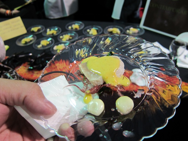 Lou on Vine’s offering. This was a pork belly wrapped around a shrimp roasted slightly with a tangy orange sauce with a kumquat. Then they had a roasted duck on french bread. Hands down the most complicated dish. Check out the bamboo plate. Lou’s often featured on the Market Report with Laura Avery on KCRW’s Good Food. Great place, I’ve been there before and do plan to return. louonvine.com