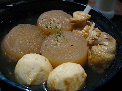 後來,有次看到正巧看到電視上報導這家「辣妹關東煮」,這才知道原來這家關東煮大有來頭,那個跟我們聊天的老闆娘其實之前是個電視製作人,因為厭倦電視製作的工作,才改行賣關東煮。他的白蘿蔔很講究,就像日本的作法一樣,需要在邊角稍微削掉一圈,這樣高湯才能入味。我可是有看黃金傳說才知道日本的正統作法唷,其實日本的正統作法還包括,需要將白蘿蔔外皮削掉厚厚的一層,至少1公分,少了那層粗厚的纖維,才能讓高湯真正的入味。