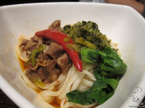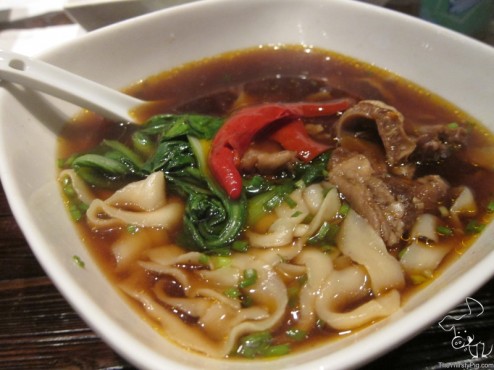 Then our entrees arrived, the Tomato Egg Drop Soup, Roasted Beef Noodle, Spicy & Sour Noodle. I had the Roasted Beef Noodles, and my friend Miss K had the Spicy & Sour Noodles and the Tomato Egg Drop Soup. The Spicy & Sour Noodle didn’t include soup, so she got an side of the soup. The Roasted Beef Noodles came with the soup, which was not bad. I like the texture of the noodles that I selected, the hand knife cut noodles – which were chewy, but not too chewy. The beef was tender as expected, along with the tendons. When I started eating Beef Noodle soup, I, at first, didn’t like the tendons with my beef noodle soup, but nowadays, I am used to it. The bright red pepper, which would scare most people, offered a nice presentation. Heck I even tried to eat it. Luckily it wasn’t spicy. Yet, at the end of the day, I liked the noodles and soup, but it wasn’t the best that I had. Also, make sure you add in the sour pickled vegetables to the soup noodles. This adds another flavor dimension. Unfortunately, the Spicy and Sour noodles didn’t pass the mark. The sour aspect, which is unusual, was a bit off settling. When Miss K asked to trade noodles with me, I politely refused…Yes, I should have been nicer to switch.